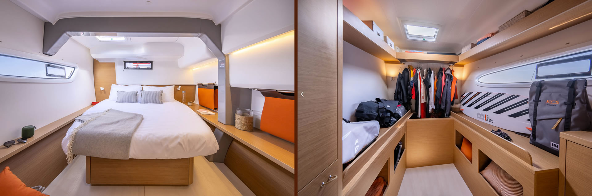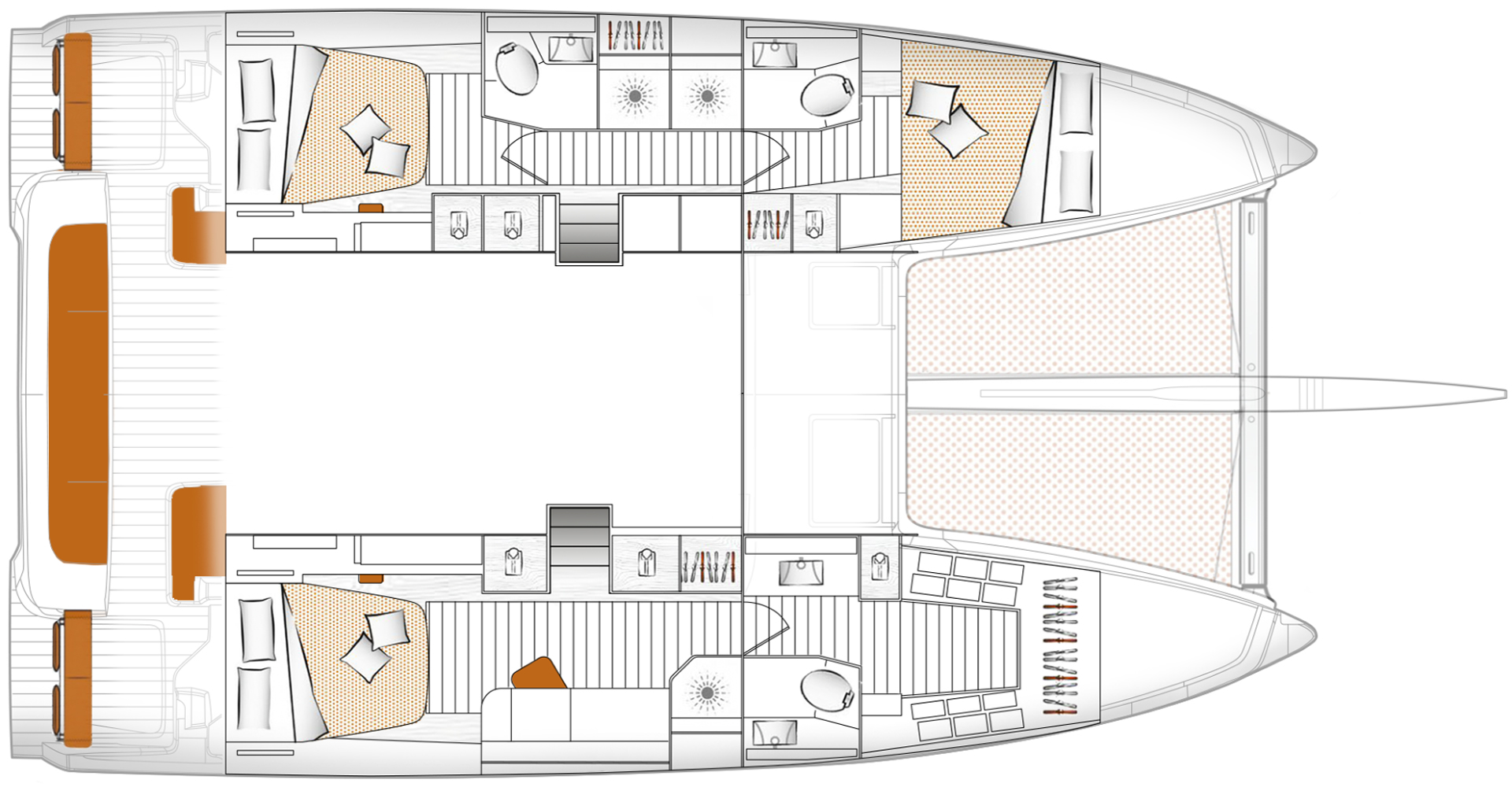 Excess 14 Catamaran Lower Deck Floorplan (Cabins | Multi-Purpose Room)